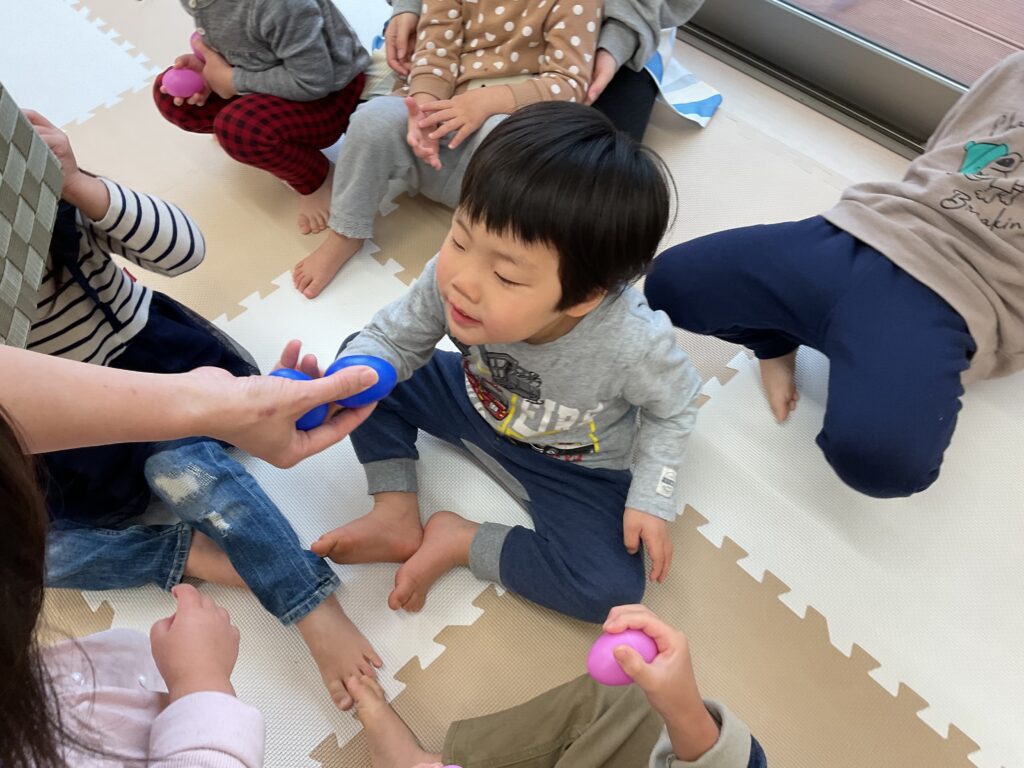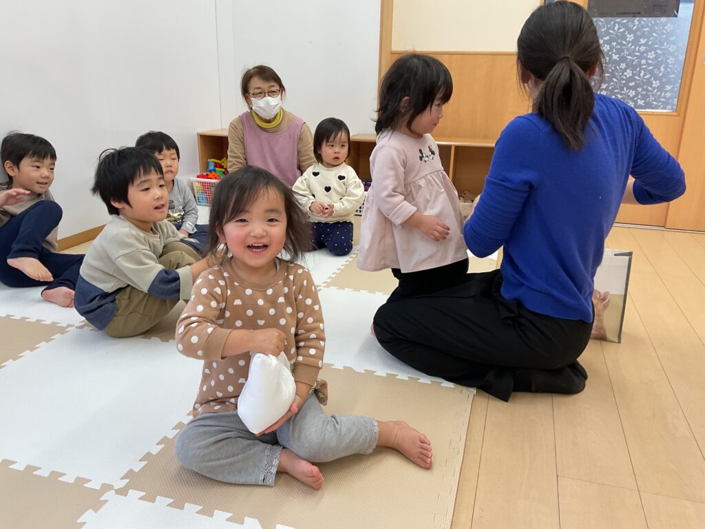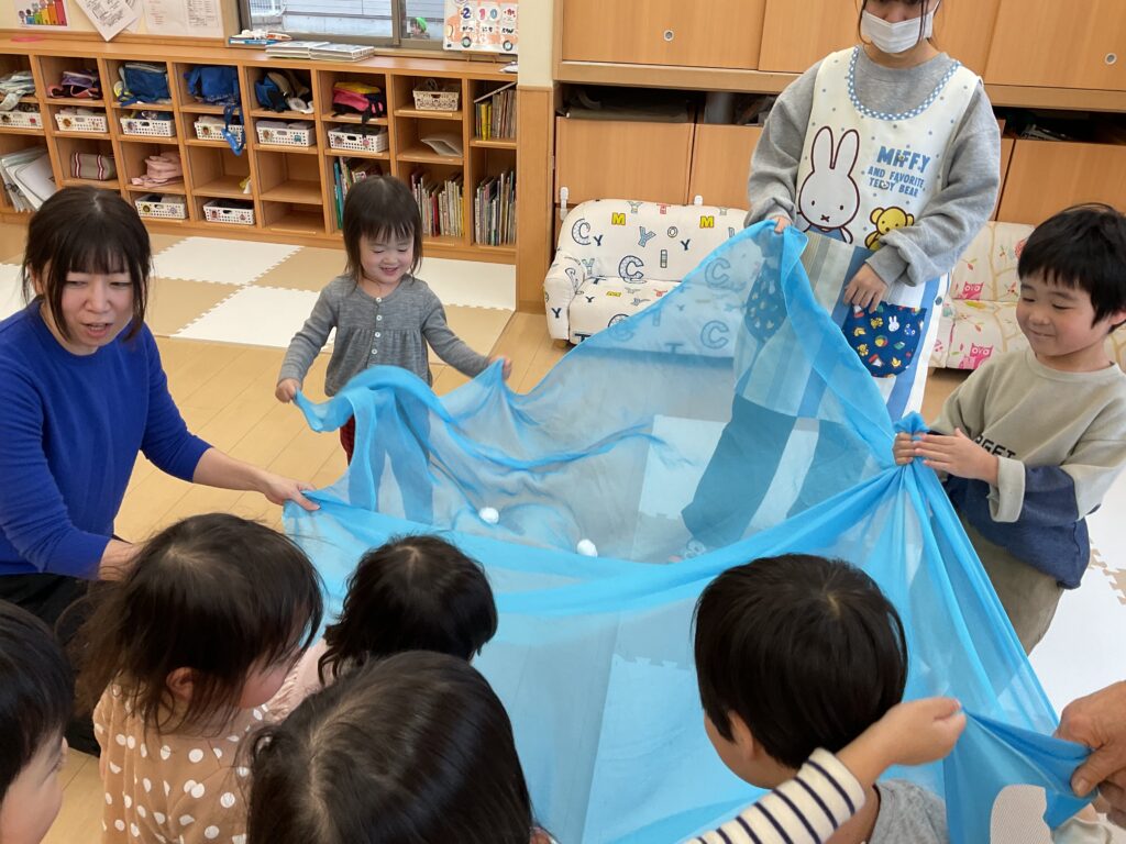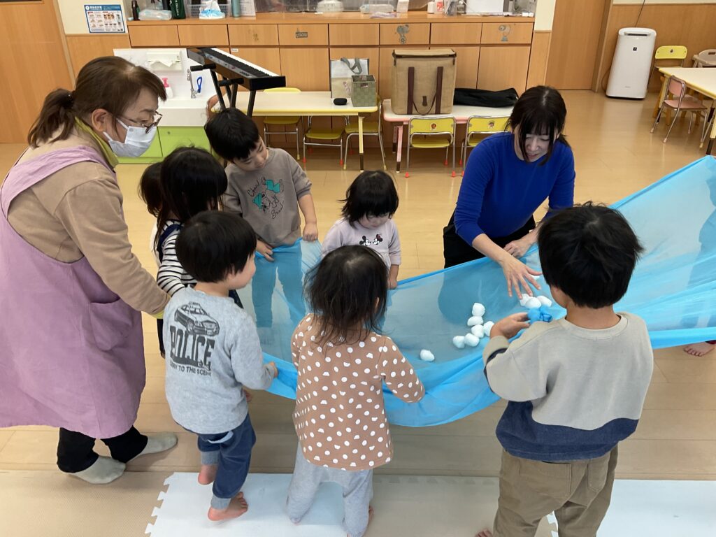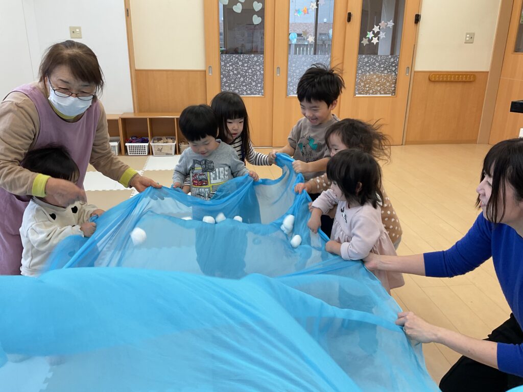 大きな雪玉を頭にのせてバランスをとったり、ふわふわのオーガンジーにのせて高く持ち上げたりと、体をたくさん動かしながら笑顔いっぱいで取り組んでいました✨