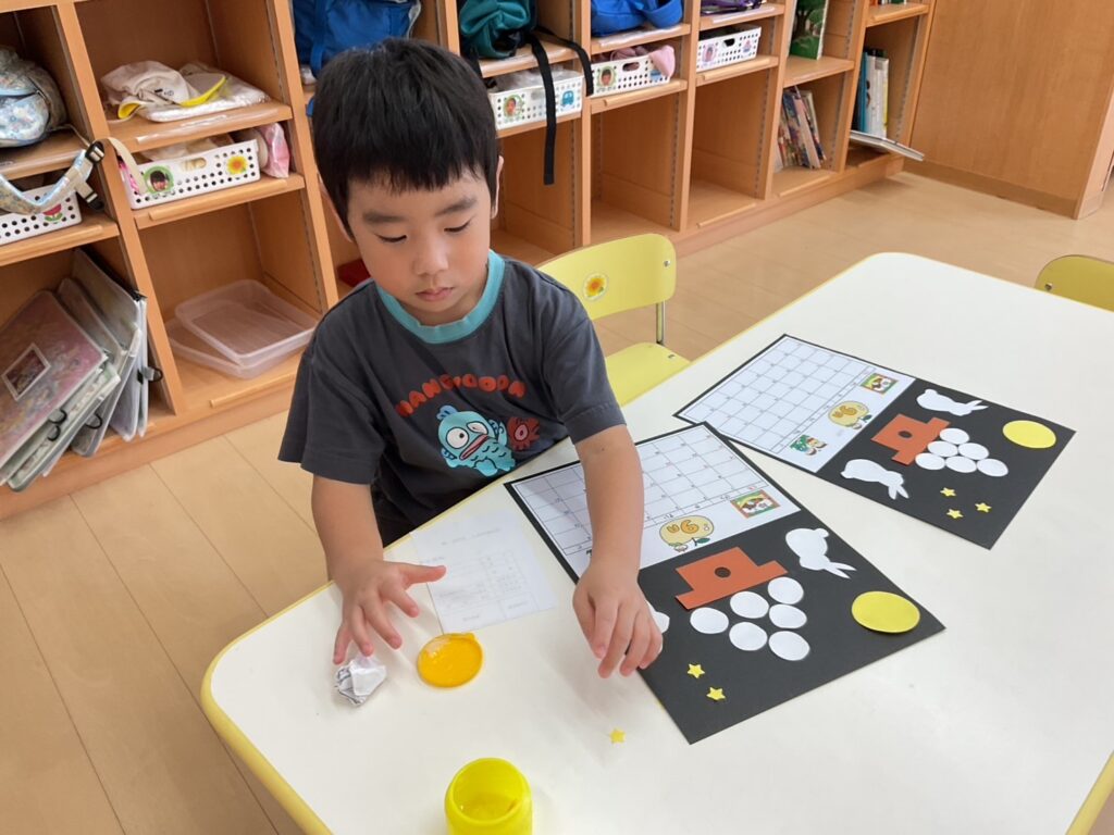 小さい子クラスはお月様🌕に白のスタンプをペタペタしました🥰