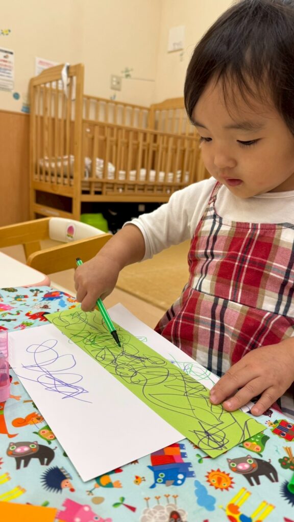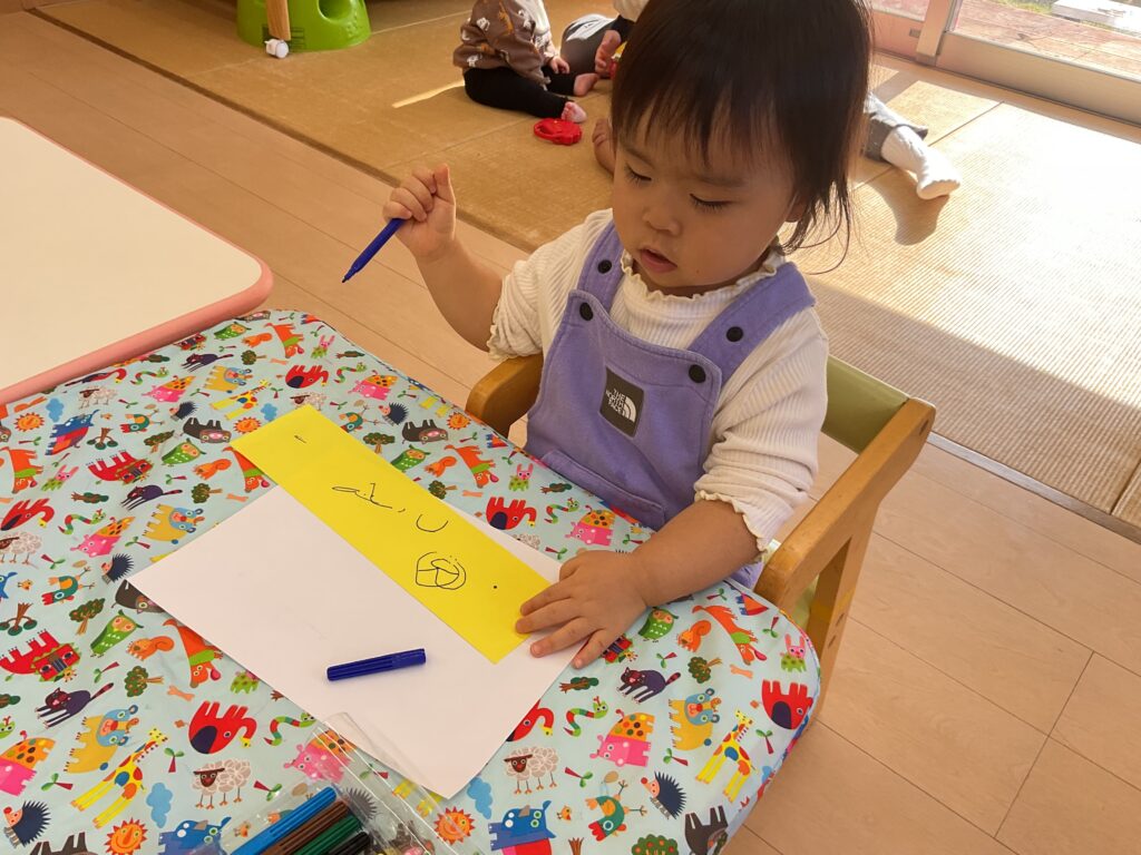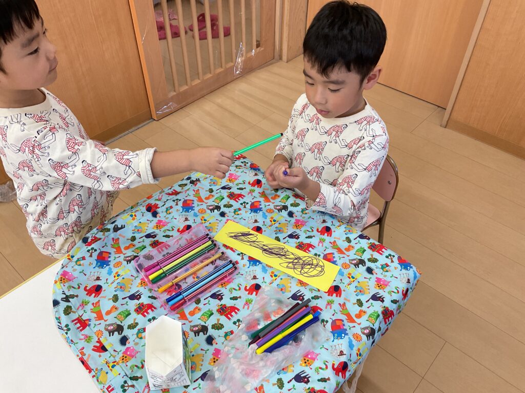 好きな色の色紙に子どもたちがお絵描きをし世界に一つだけのバッグが完成しました🥰👏