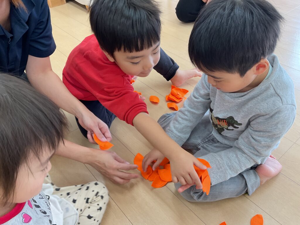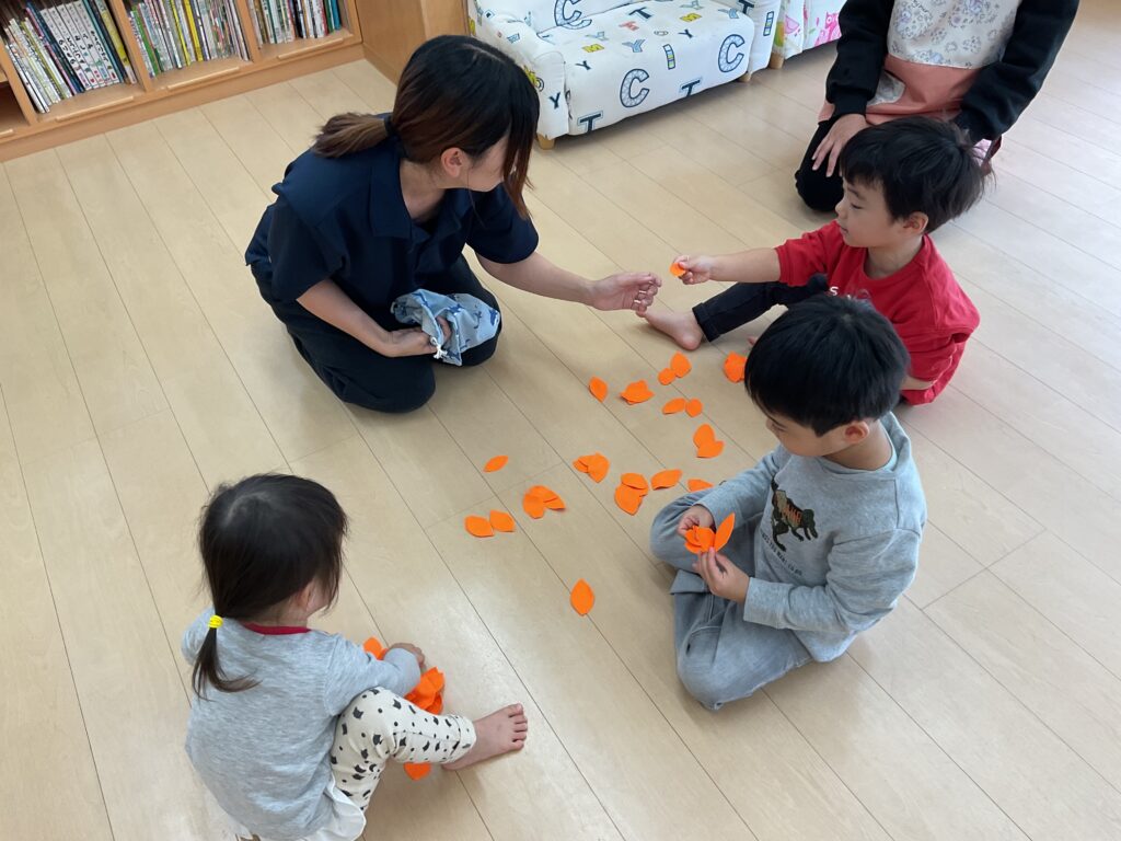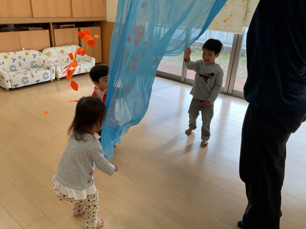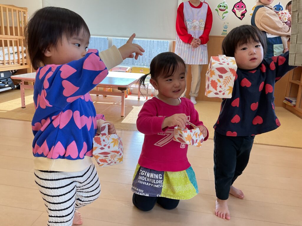 11月は、フェルトを葉っぱ🍂の形に切ったものをオーガンジーに入れて降らせて遊んだり、リトミックの先生が秋バッグを作って持ってきてくれました👜