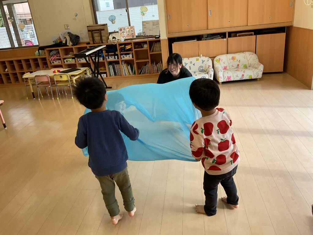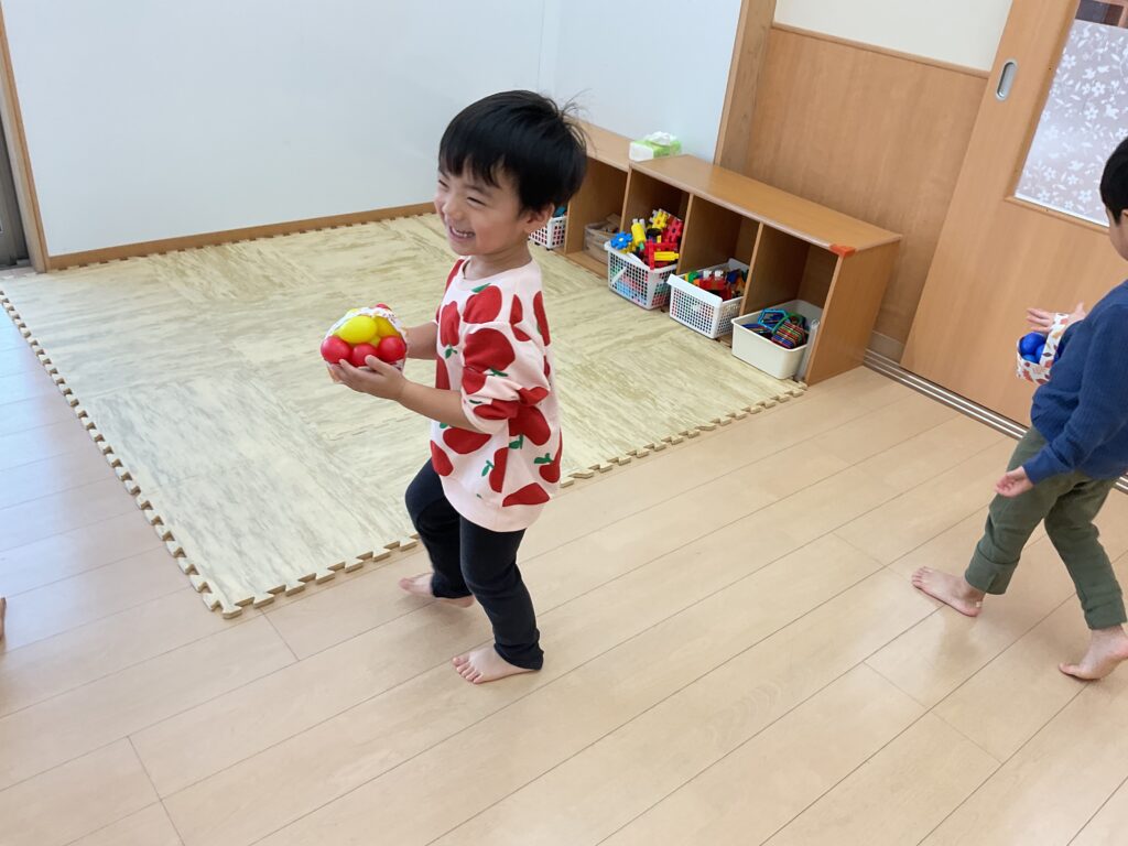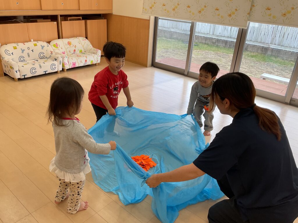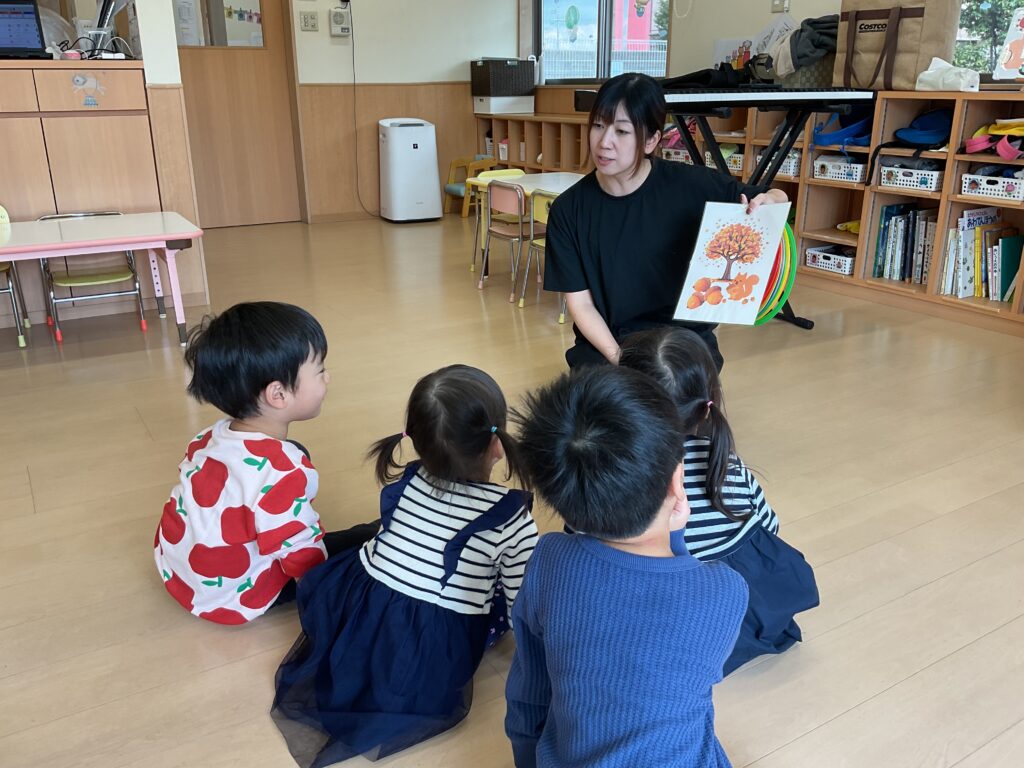 11月は、フェルトを葉っぱ🍂の形に切ったものをオーガンジーに入れて降らせて遊んだり、リトミックの先生が秋バッグを作って持ってきてくれました👜