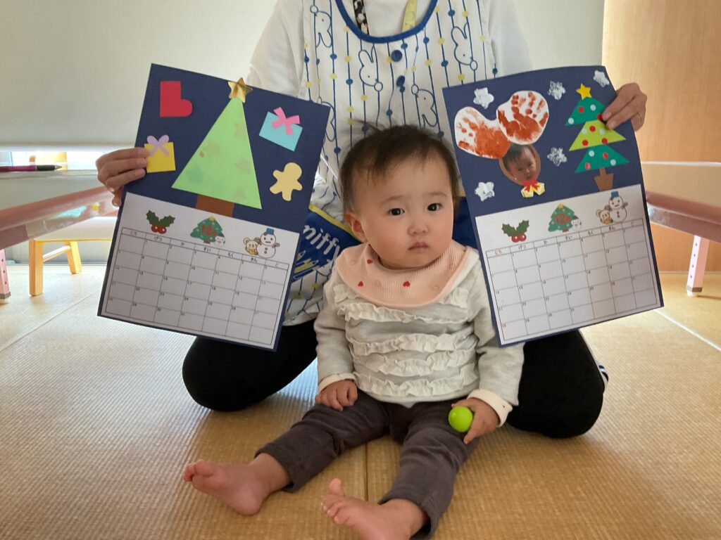 0歳児さんは手形を取り、鈴に見立てました🛎️お顔も貼り付けて、とても可愛らしいカレンダーが完成しました🥺