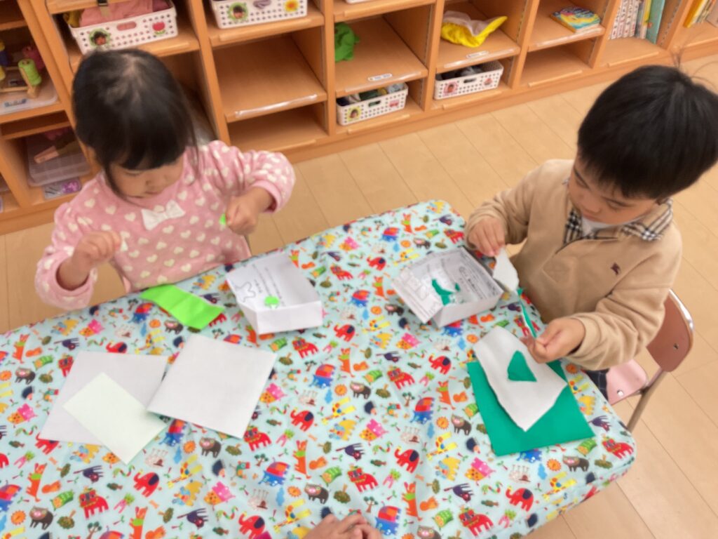 4歳児さんはハサミを使ってツリー作り🎄線に沿って丁寧に、慎重に切る姿がとてもカッコよかったです🥹