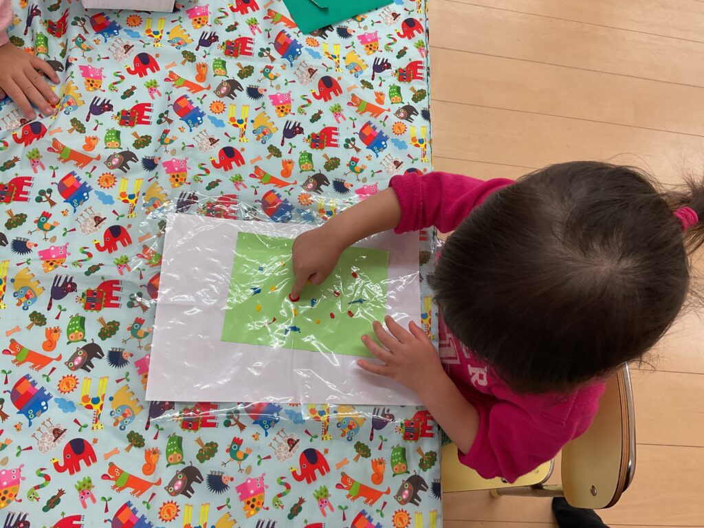 2歳児さんはフィンガーペインティングに挑戦❗️絵の具の不思議な感触に興味津々でした😊