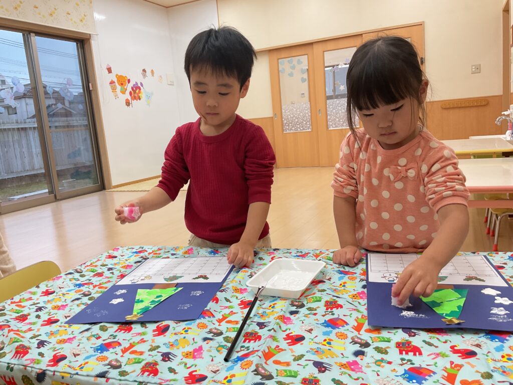 3歳児さんはちぎり絵に取り組み、周りには星のスタンプで雪を降らせてみました❄️指先を使い集中して製作をしていました🎶