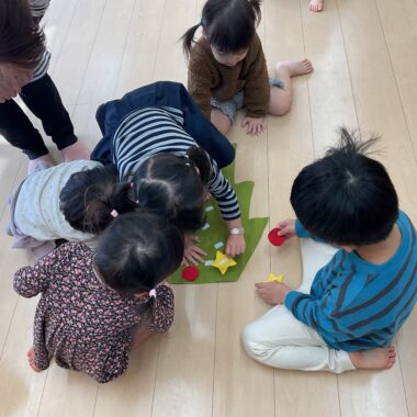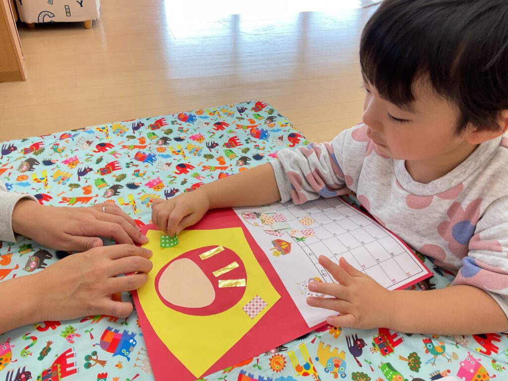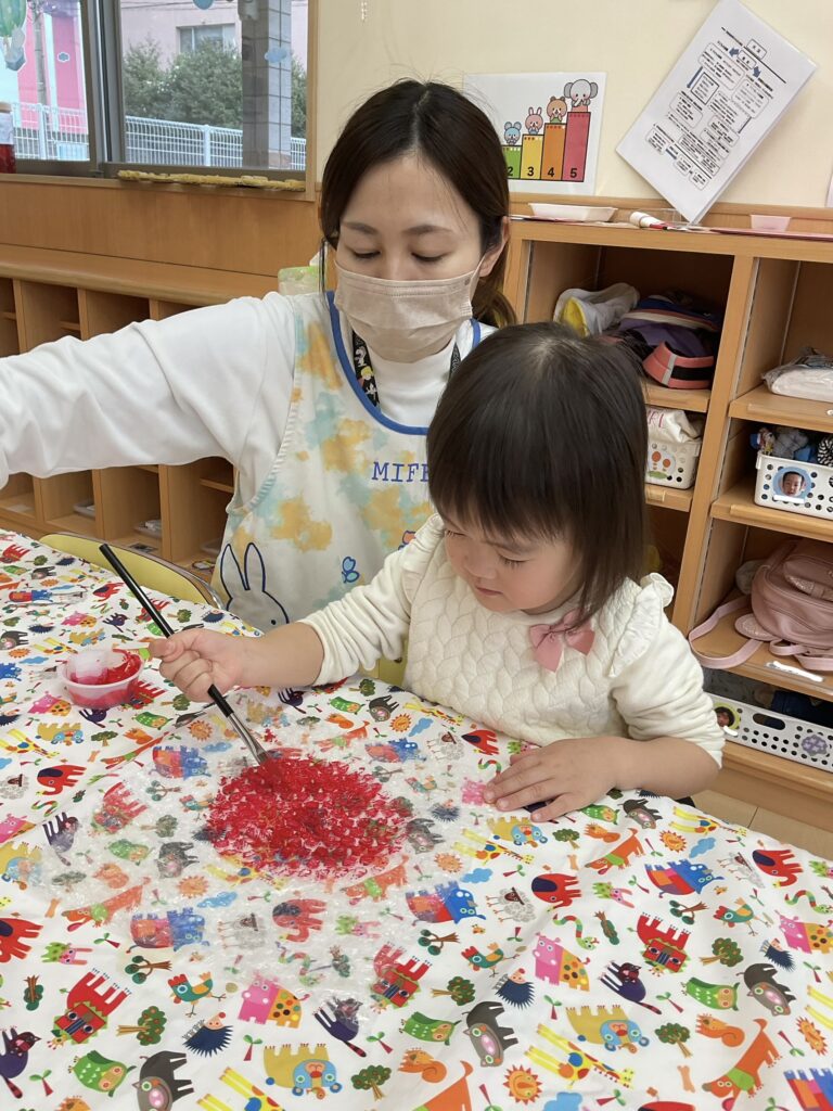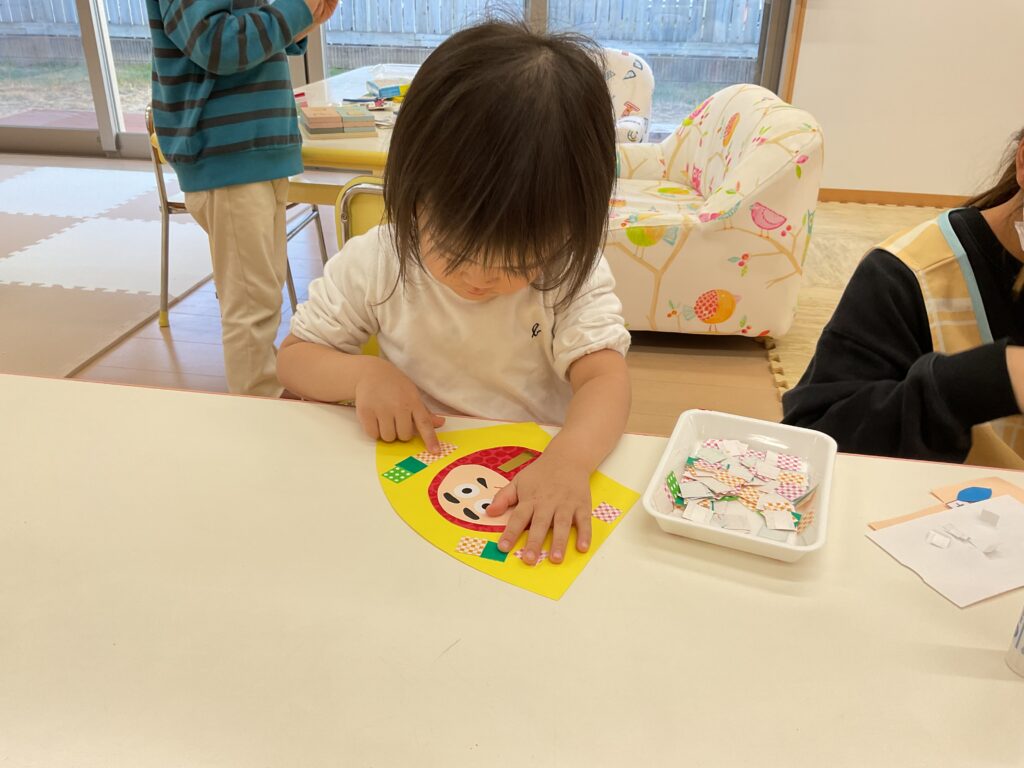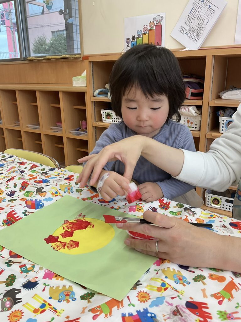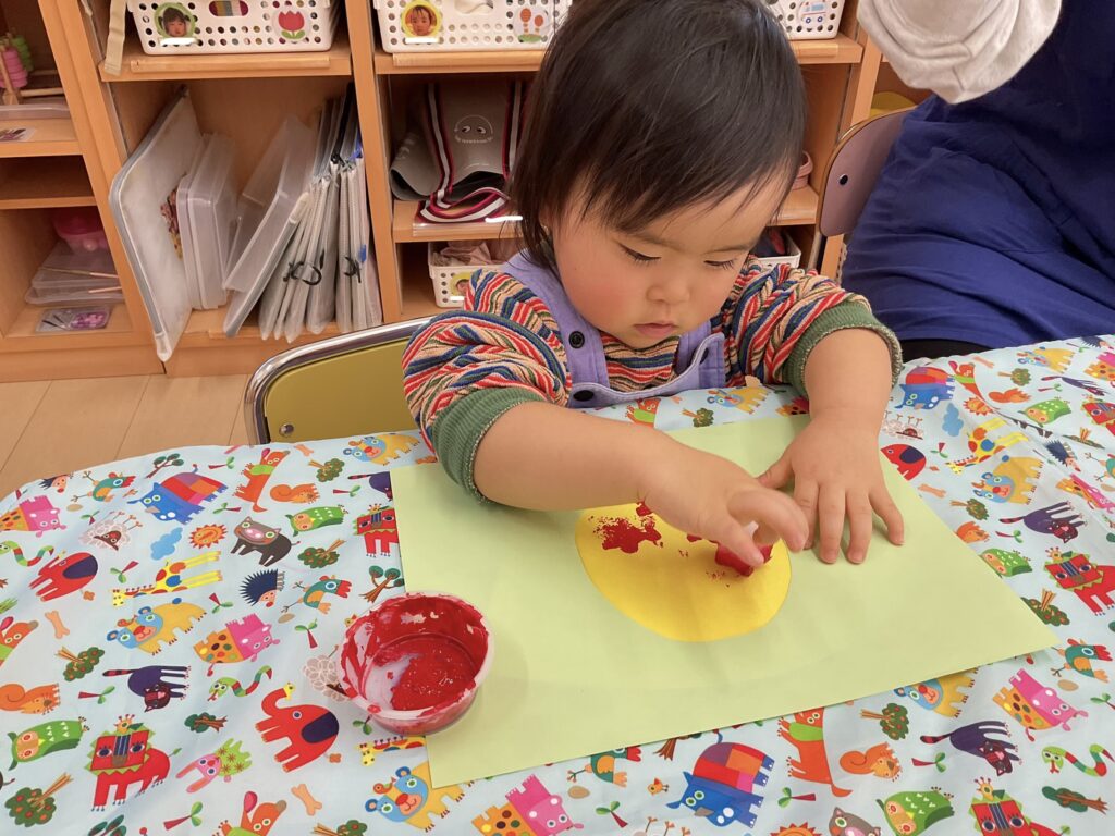 小さいクラスのお友達は手形を取ったり、スタンプを押したりしながら、ダルマ作りに挑戦✨絵の具の感触を楽しみながら、可愛らしい作品が完成しました🥰